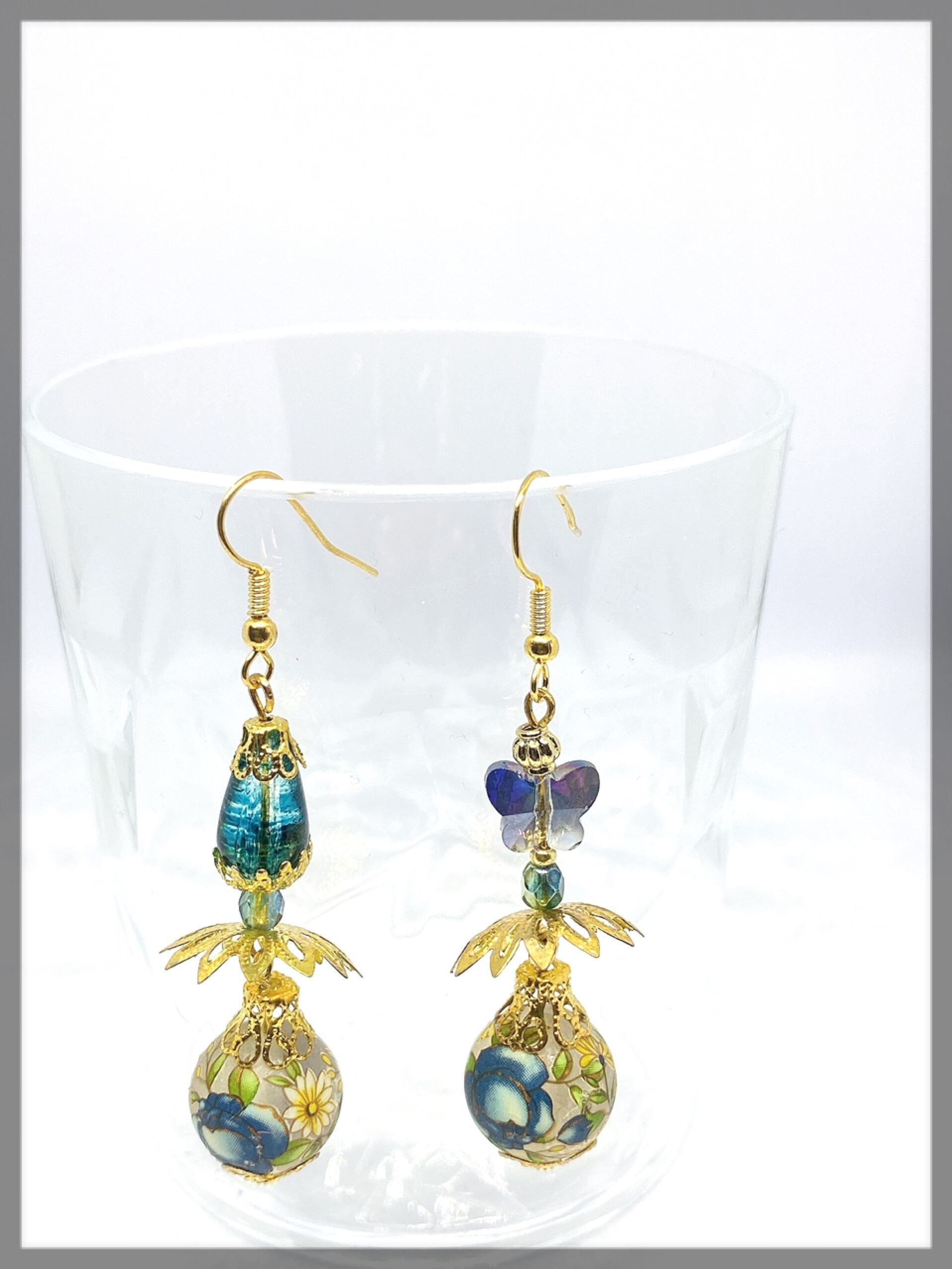 プリントビーズをメインに使い、ビーズキャップや蝶のガラスビーズでチャイナ感を表現しました。