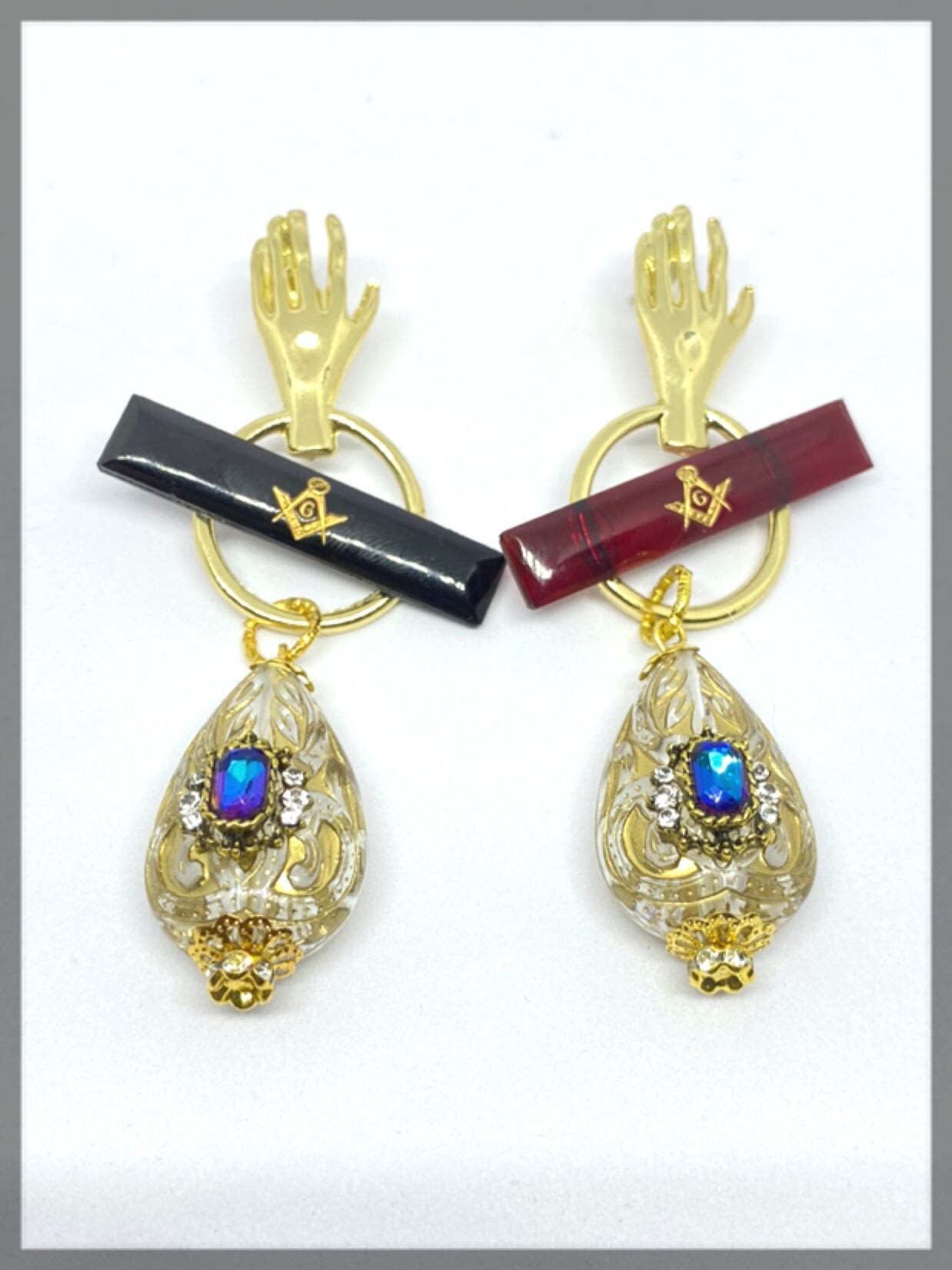 フリーメイソンの不思議さを表す為、ドロップパーツに偏光のストーンをプラスしました。