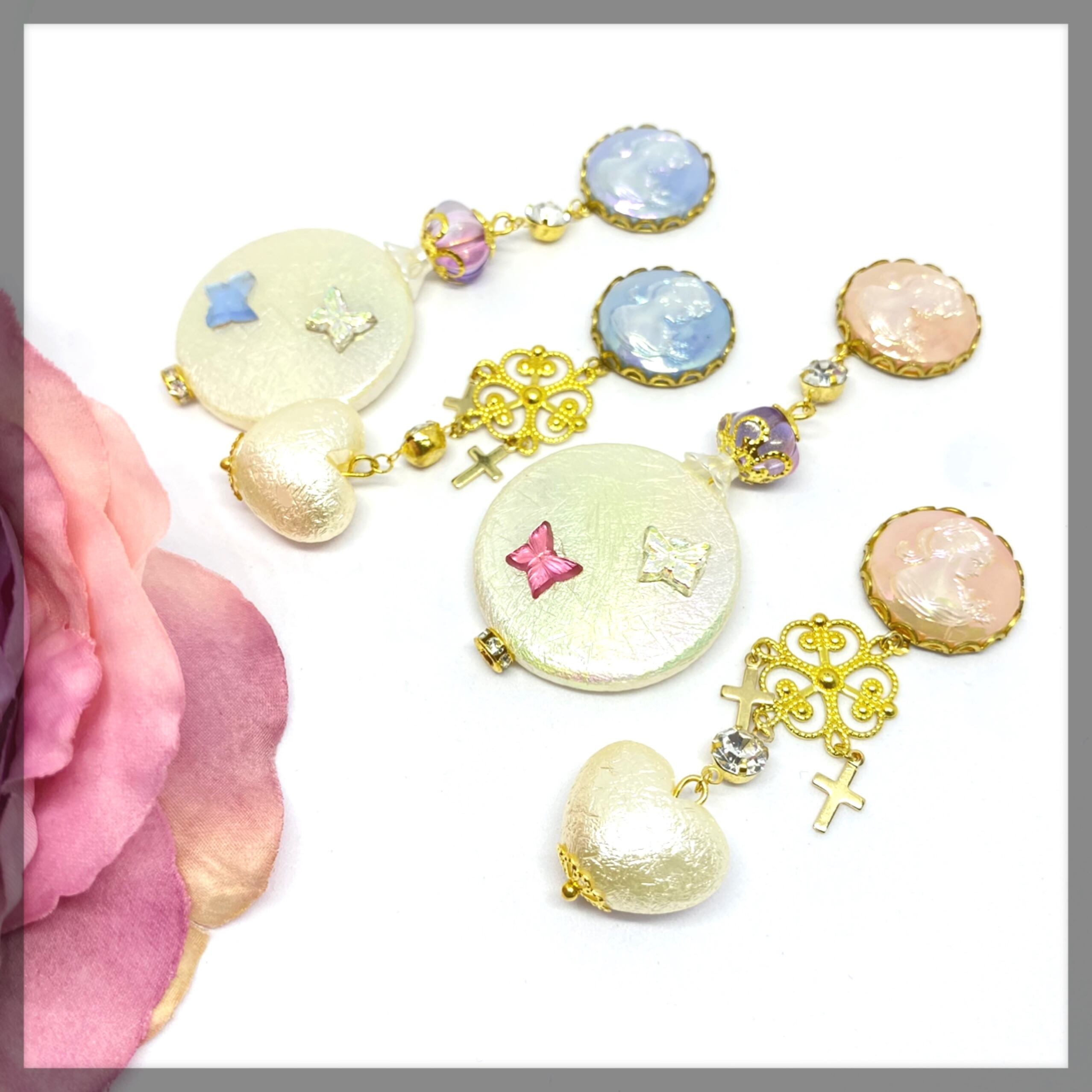 フリルたっぷりのお洋服にも、レザーのライダースにも、儚く、可愛く、時に強く、ご自身のファッションにアクセサリーをあわせてお使いくださいませ。